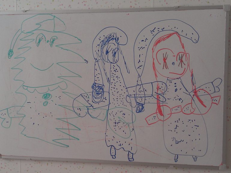 По поводу невесть откуда взявшейся краснухи уже неделю сидим дома, занимаемся творчеством. Изрисовали три бумажных альбома, скатерть, простынь в кроватке, себя, маму и всю домашнюю одежду. Поэтому, чтобы остановить сие стихийное бедствие папой была приобретена магнитная доска, которую мы очень полюбили.
