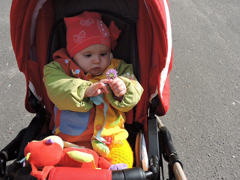 В коляске сама садится и с лёжа и с полусидя(хватается за капюшон))