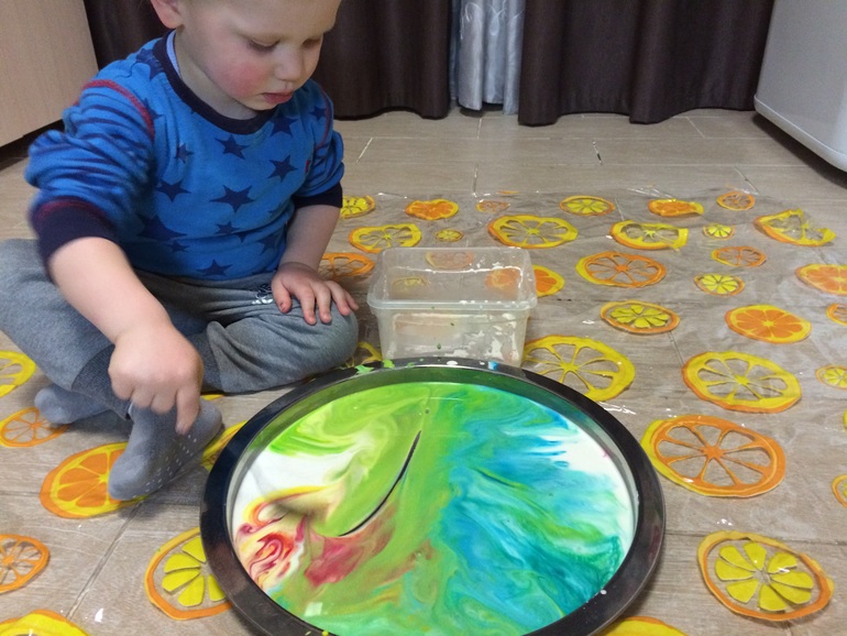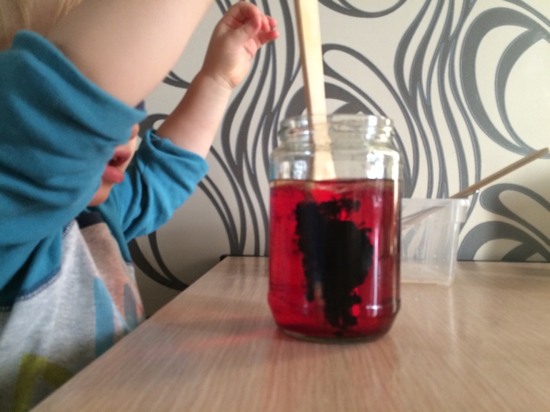 День 2. Делали салют в стеклянной банке, только сначала слишком много красителя налили, и наша жидкость стала бурой и никаких салютов не вышло. Взяли другую банку, снова всего налили, немножко получилось, и быстро все опять стало одним цветом. Диме конечно нравилось размешиваль все равно что всеми подряд столовыми приборами, поэтому все равно было интересно.