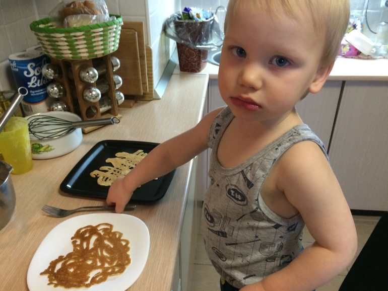 День 1. Масленица. Пекли с Димой блины, да не простые а ажурные:) Дима активно участвовал в замесе теста: разбивал яйца, взвешивал и просеивал муку, размешивал. А также активно учасвтовал в поедании блинчиков. Я рассказывала ему о празднике.