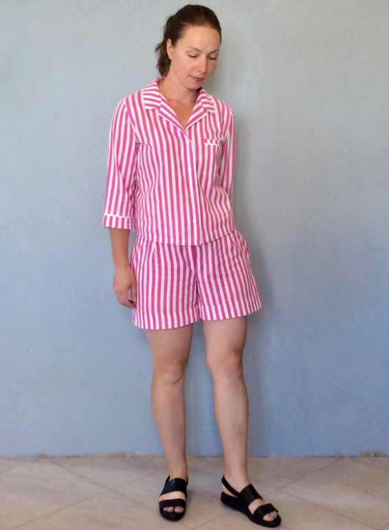 Пижама украшена белым кантом, с нагрудным кармашком и двумя карманами в брюках и шортах. Возможно сшить однотонный комплект.