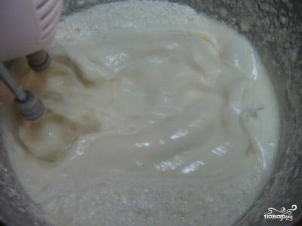 4. Сливки и сгущенку взбиваем сначала вместе, пока не поднимется смесь, а затем добавим апельсиновый сок с желатином. Этот крем выливаем на корж, ставим обратно в холодильник на несколько часов.