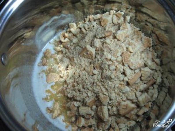 1. Печенье измельчим в крошку, смешаем с растопленным маслом, трамбуем руками такой корж на дно формы. Отправим в холодильник.