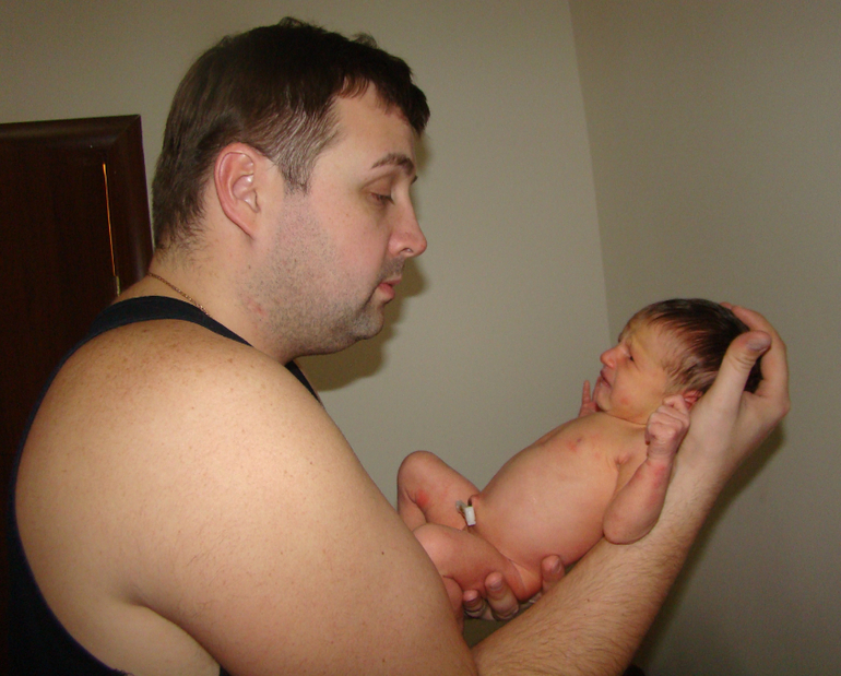 Одна доча лежала у меня на груди---вторую положили на грудь Мужу. Сел на стульчик---снял майку.