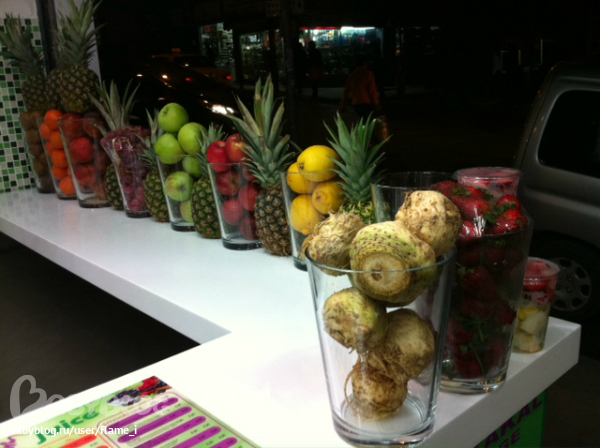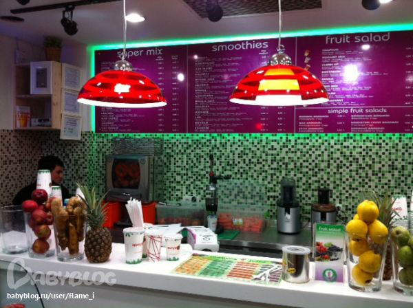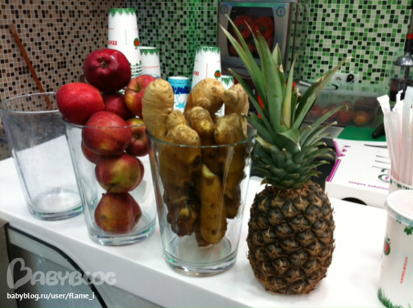 Мы брали микс - апельсин+гранат. Манго+ананас. Яблоко+виноград. и Манго+ИМБИРЬ, и Грейпфрут+Имбирь!! Да-да! Свежий корень!! ну маринованый с суши я ела....в чай с молоком добавляла, напиток с лимоном и медом заваривала...но чтобы вот так - свежий сок!!!!!!!!