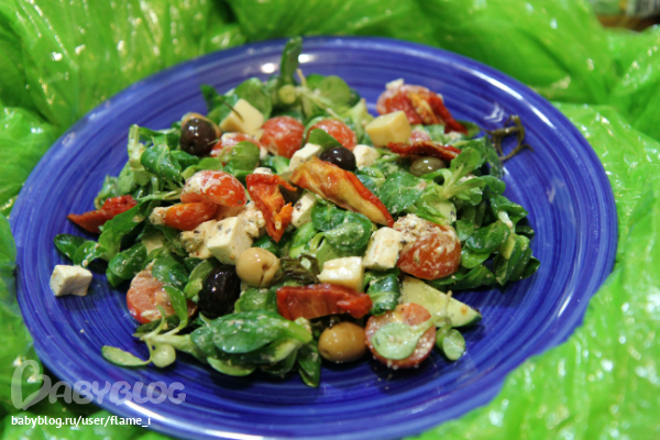Мы только прилетели из Стамбула...привезли с собой "набор" оливок от малюсеньких - размером с изюм...до больших...и самых разных цветов, вяленые помидоры... Добавила заправку из оливкового масла и фетой (с оливками) - и салат для моего Мужа готов.