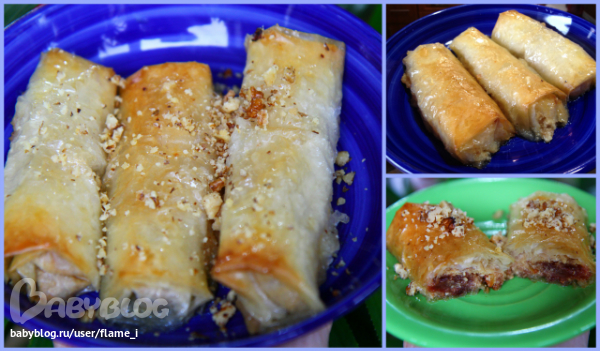 Смазала листы сл.маслом, положила начинку, свернула...запекла в дуковке при 210 градусах. Затем залила сиропом (вода+сахар+мед)....и сверху орешки....
