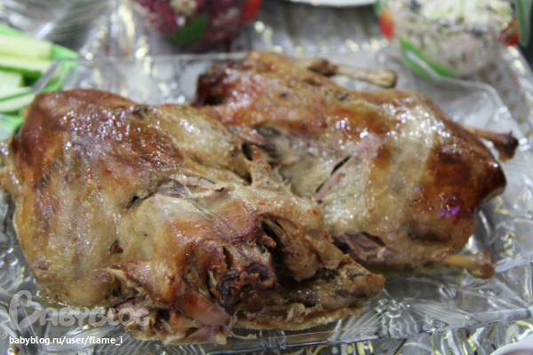 Затем в РУКАВ, во внутрь яблоко и лук (целиком), минут на 30 при 250 градусах, потом при 175 на 2 часа) и все.