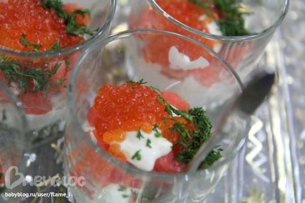 на дне - авокадо кубиками, сверху сыр "Филадельфия", семга слабосоленая кубиками и ложка красной икры.