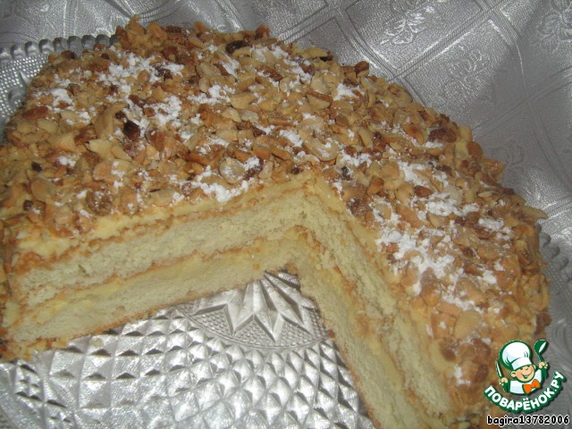 По ГОСТу : классический бисквит, пропитанный сиропом с ромом(коньяком), крем Шарлотт ( заварной крем),посыпанный измельчённым арахисом.