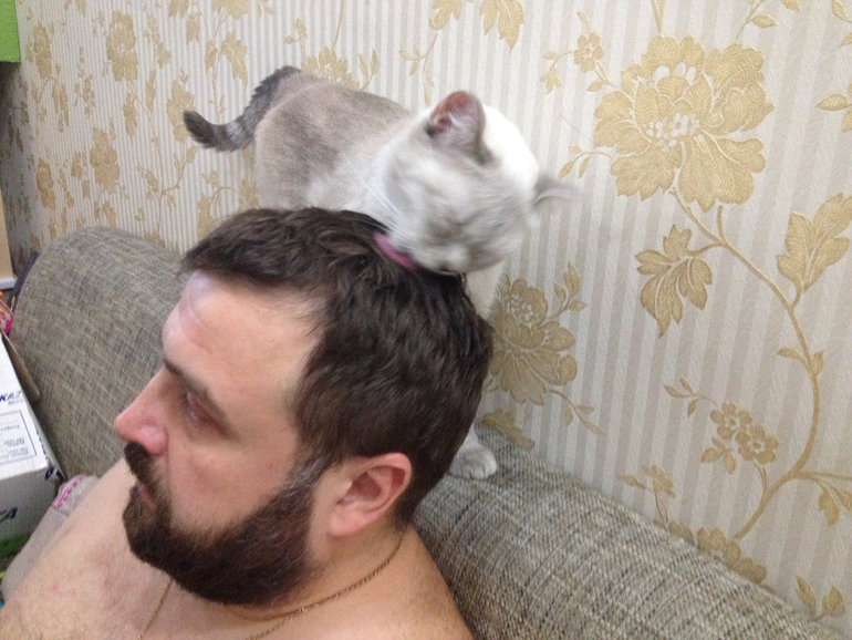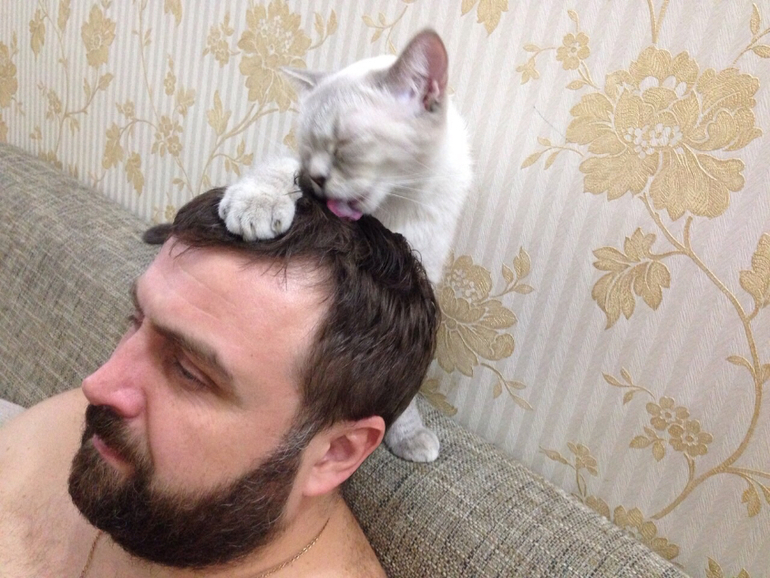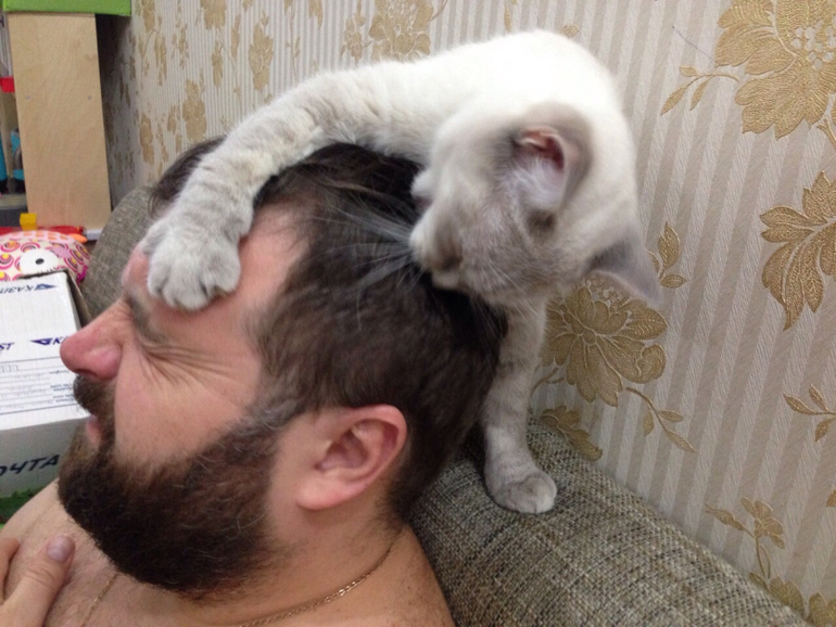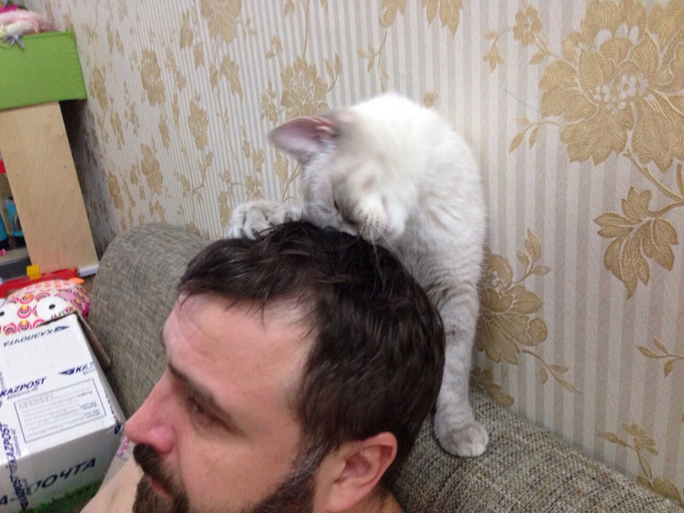 Как только приходит с работы, садится на диван, то наша (совсем раньше не ласковая и "нетрогайтеменя" кошка) - прыгает на спинку дивана и начинает, как мы называем "кототерапию". Сначала вылизывает макушку, затем начинает "покусывать" вполне себе больно, если пытается Папа отстраняться - то она его лапой с когтями к себе обратно, типа "сидеть"!