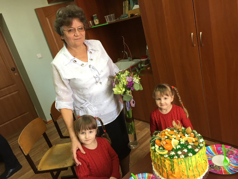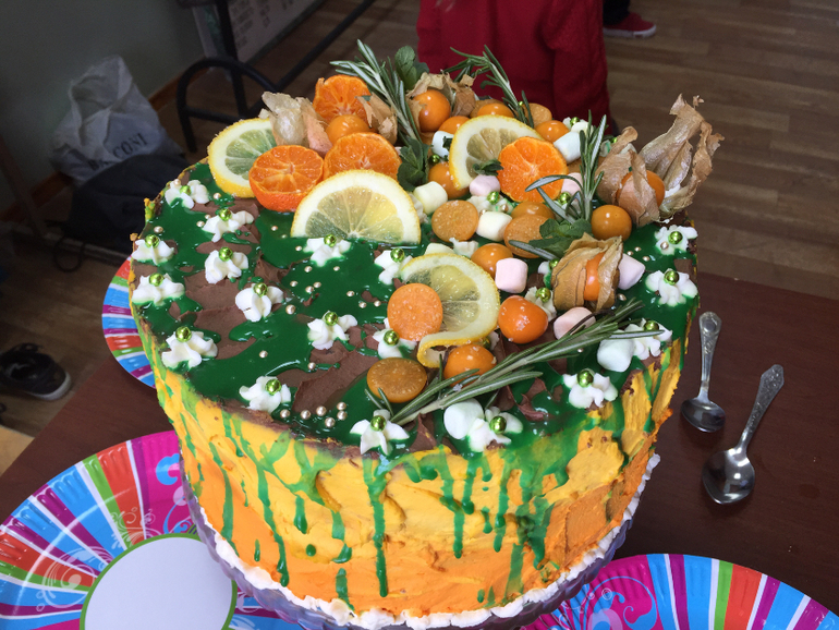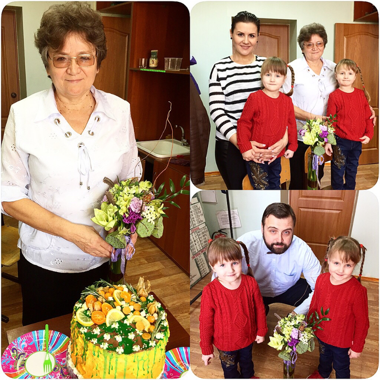 Он нас, по традиции, торт, мною сделанный и букет на заказ...