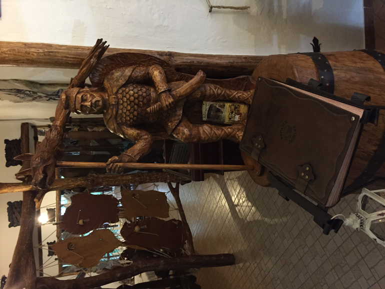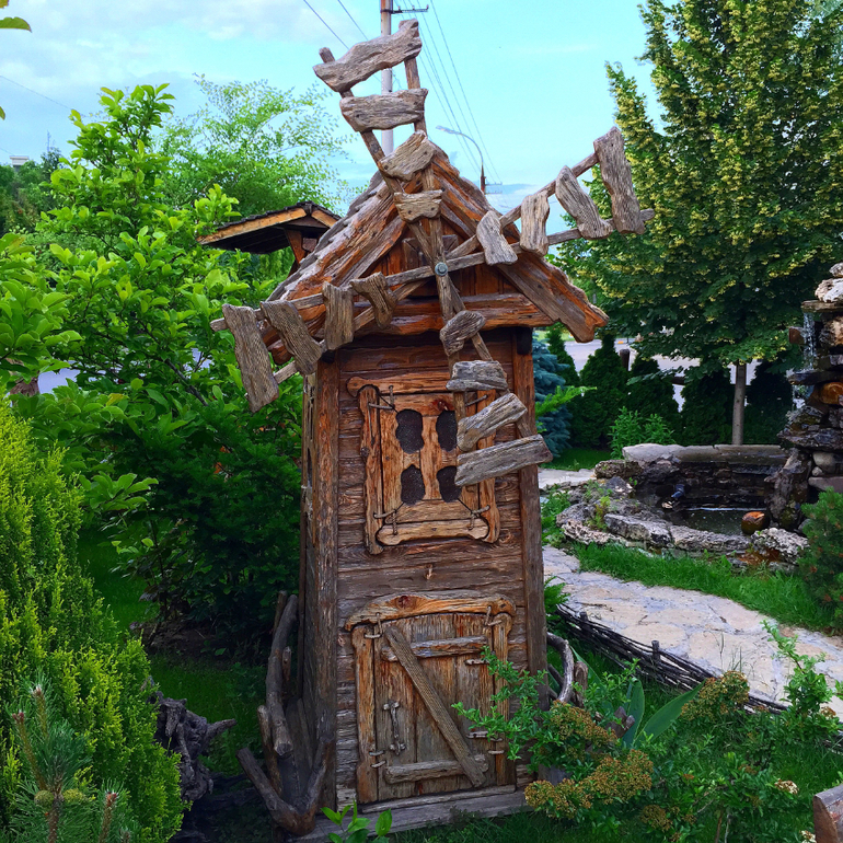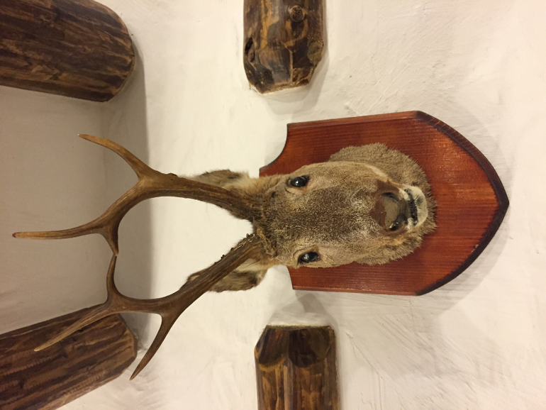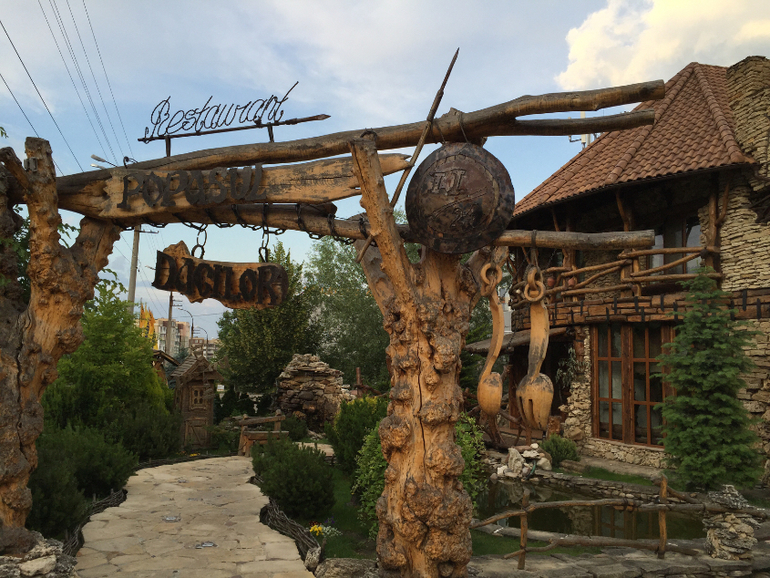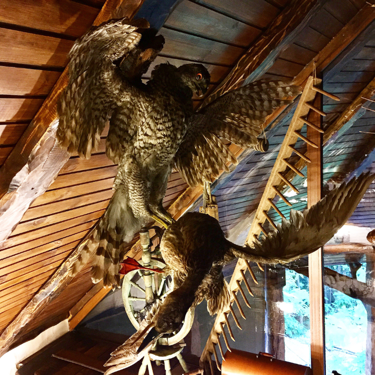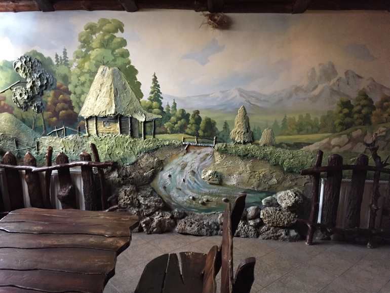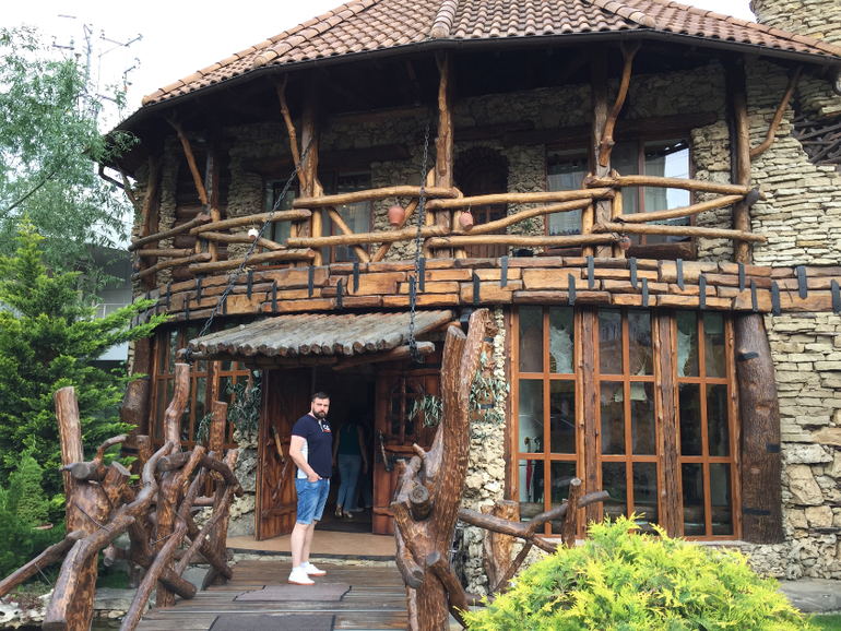 Расположен среди деревьев, натуральный сруб, везде камень, железо, шкуры и прочее... Все очень качественно - "4 года адской работы", как сказал администратор.
