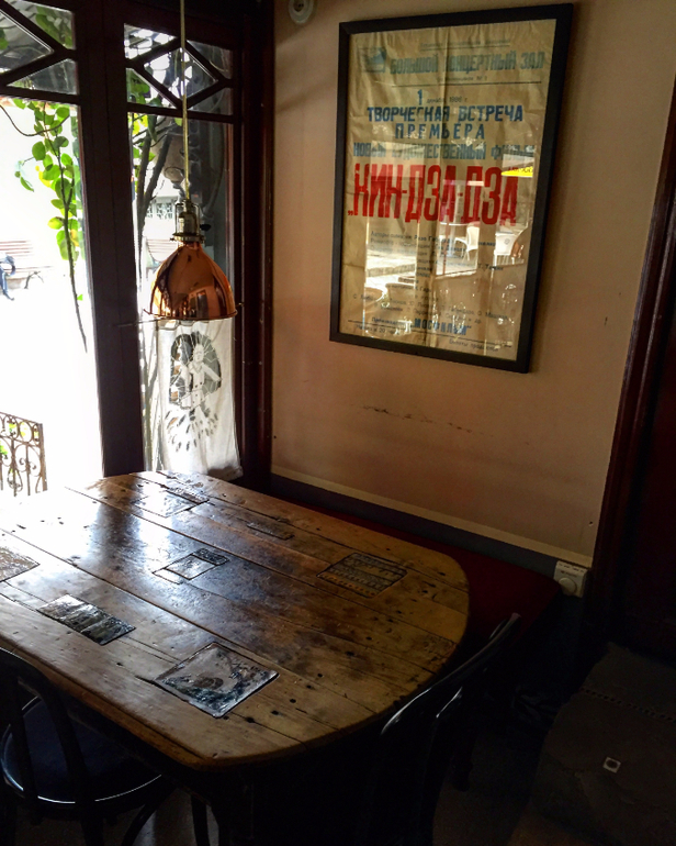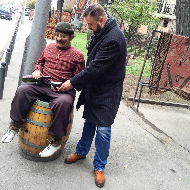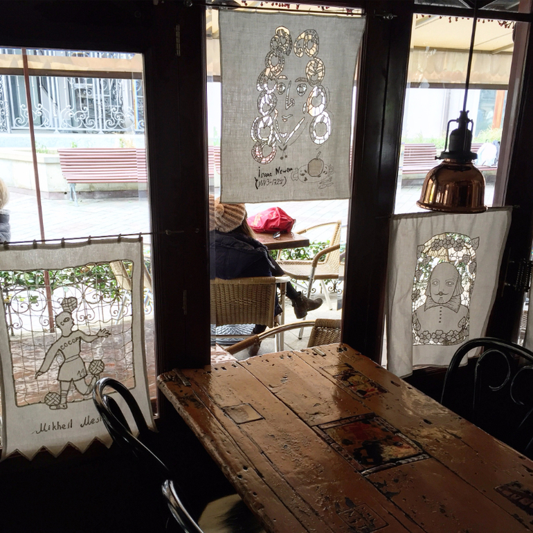 Вот рядом с этой церковью в старом городе, в самом центре грузинской столицы, стоит башня, которую построил Резо Габриадзе. И правда, в двенадцать дня и в семь вечера на башне открываются ставни, звучит музыка, появляются куклы. Прохожие останавливаются, достают мобильники, включают камеры. Но сейчас уже чуть больше, чем семь. Поэтому мы сидим в «Габриадзе-кафе». Каждый столик, стул индивидуальны - не похожи друг на друга. Их расписывал сам хозяин. Угощают в традициях грузинского гостеприимства. Описывать это бесполезно, можно только попробовать. В меню, например, есть «Чижи-Пыжи» - это запеканка по очень старому рецепту, название которой, кстати, никак не связано со знаменитым Чижиком-Пыжиком, автор памятника которому - тоже Резо Габриадзе.