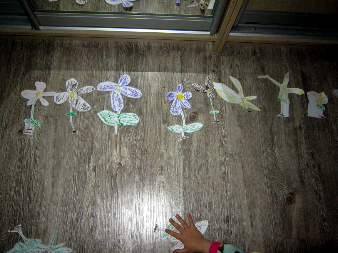 А позавчера она решила устроить праздник цветов. Нарисовала кучу цветов, я вырезала. Разложила потом все это на полу - сделала поляну)