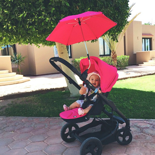 Так же есть розовый комплект для коляски (капюшон и коврик) и розовый зонтик от солнца