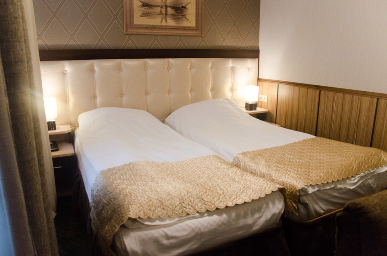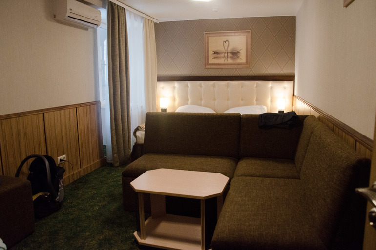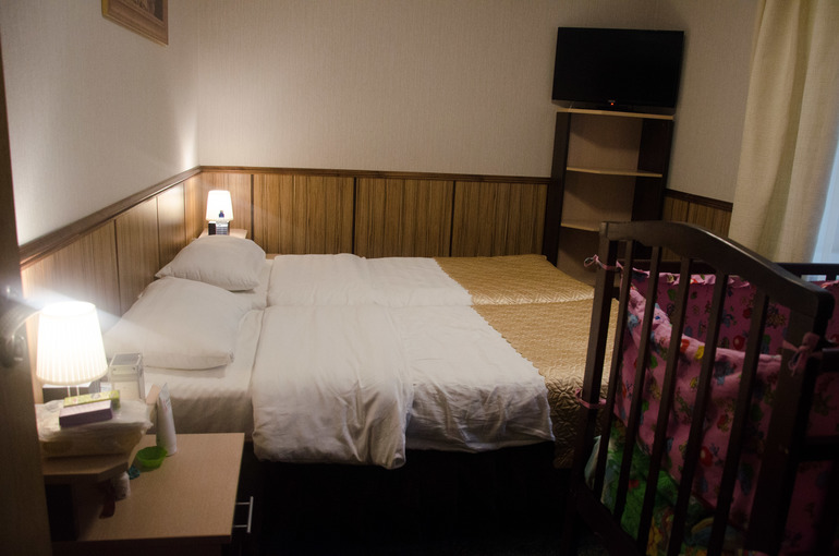 Заселили нас в первый корпус - соседнее здание с решепн. Взяли мы семейный двухкомнатный номер (чтобы уж точно отдохнуть). Номер средний, и в основной комнате, и в спальне большие двухспальные кровати и телевизоры. В спальне по нашей просьбе поставили и детскую кроватку. В основной комнате еще есть диванчик и журнальный столик, а также минибар с вполне приемлемыми ценами, но нам он не потребовался)).