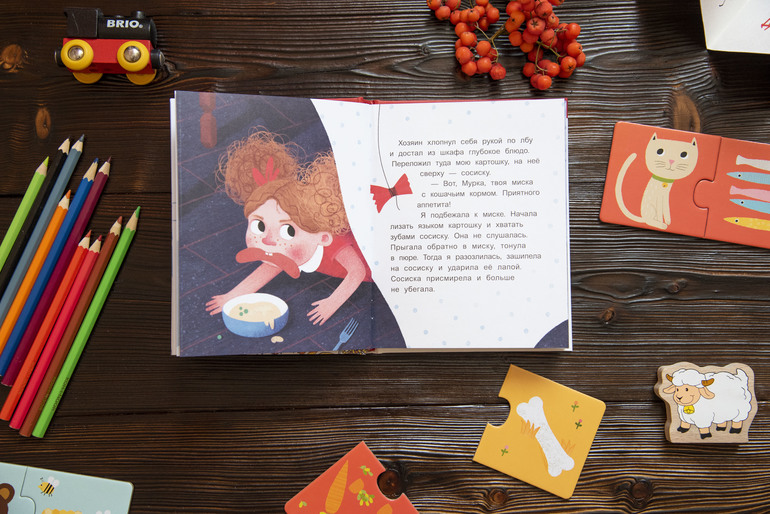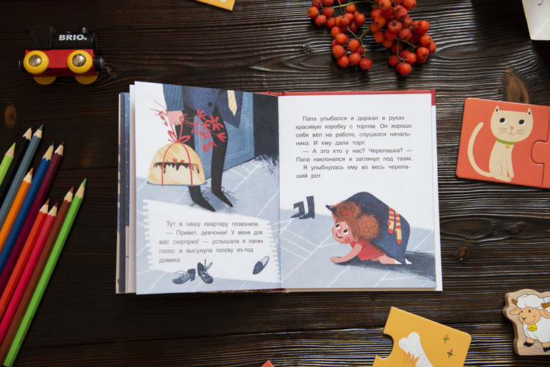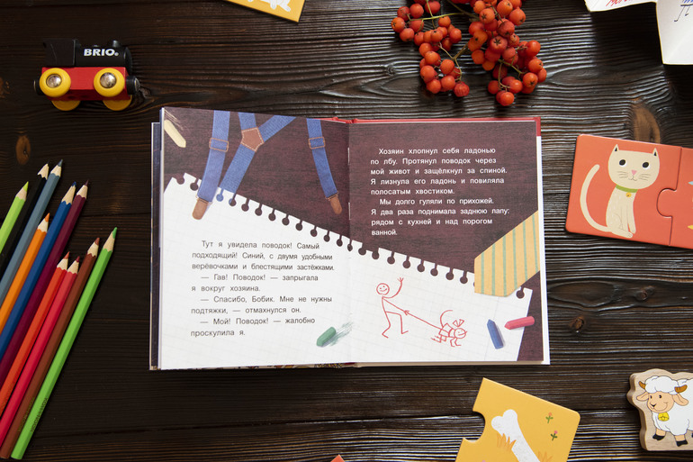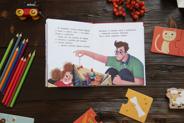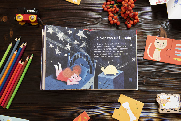 Книга очень удобного формата примерно А5, твердый переплет, плотные офсетные странички. И более того - многие дети узнают в ней себя! Помню как долгое время Настя "превращалась" в собачку и все просила папу "гулять с ней на поводке". Нам эта игра ну совершенно не нравилась, а вот она была в восторге.