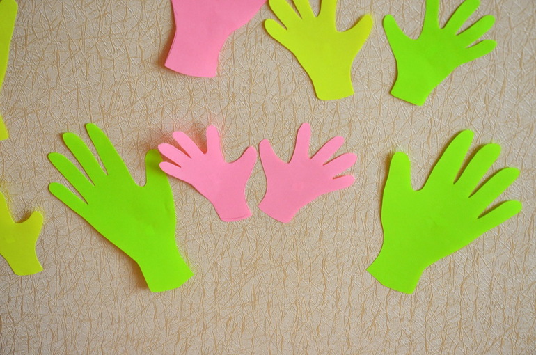 Следующая игра, которая разнообразила занятия - игры с ладошками. Вырезаю из бумаги, которая оказывается под рукой, несколько своих ладошек, несколько Настиных и одну папину. Наклеиваю их на стену на двусторонний скотч. Мы внимательно изучаем все ладошки. Про каждую ладошку спрашиваю: "Whose hand is this?" Выясняем - Настина или мамина, а потом ищем хозяина самой большой ладошки.
