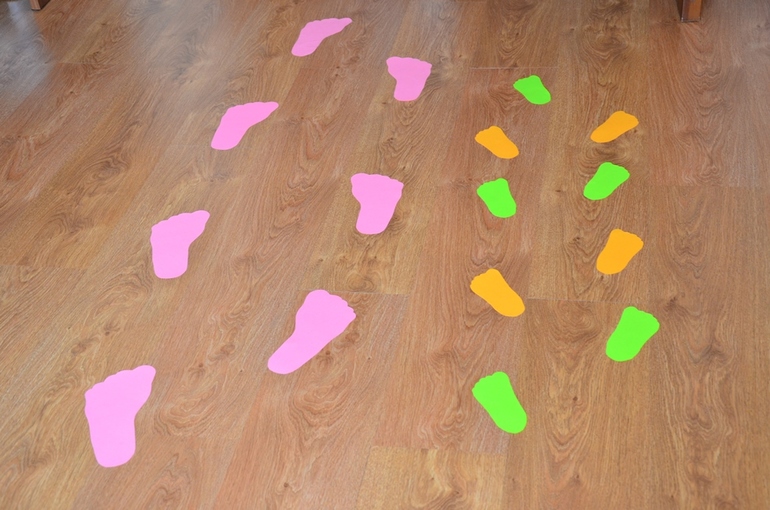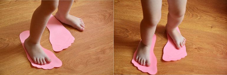 Еще мы также поступаем со ступнями. Смотрим - где чья, примеряем. "Измеряем комнату" в шагах маминых и Настиных.