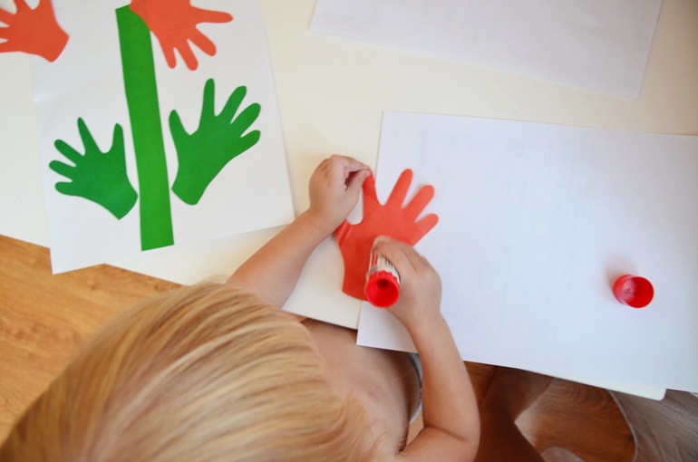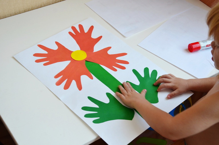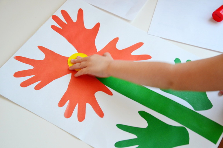 Еще мы делали - hand-flower. Вырезали Настины ладошки и сделали из них цветок и листья. Кривовато получилось, но все равно у шедевра была короткая жизнь))). Даже не успела заныкать его в папку с нашими шедеврами)).