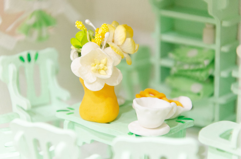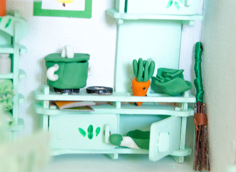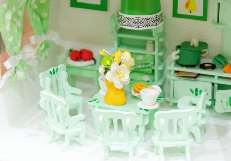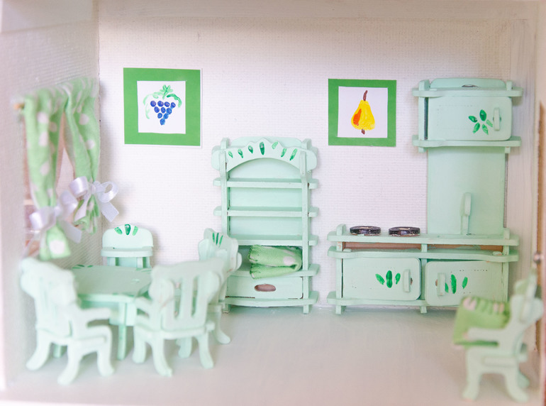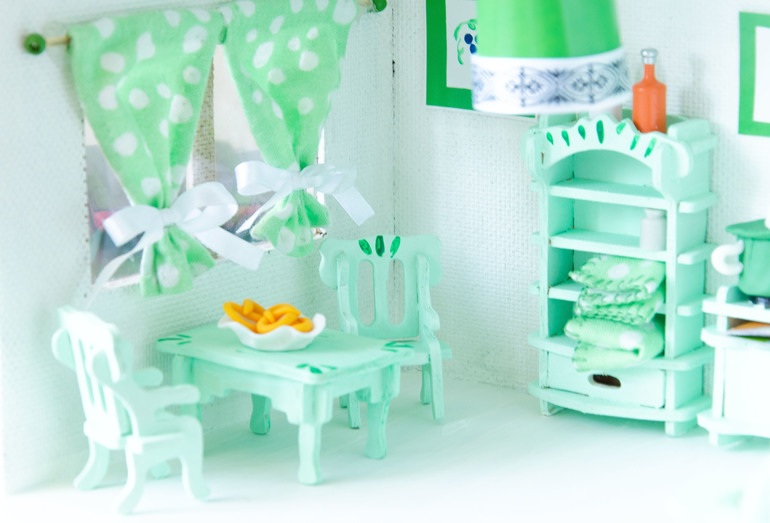 Из Сильваниан нашлись несколько бутылочек. Сделал метелку из веточек. Сшила пару полотенчиков из фланели в тон шторам. И кухня постепенно обрела вид кухни)