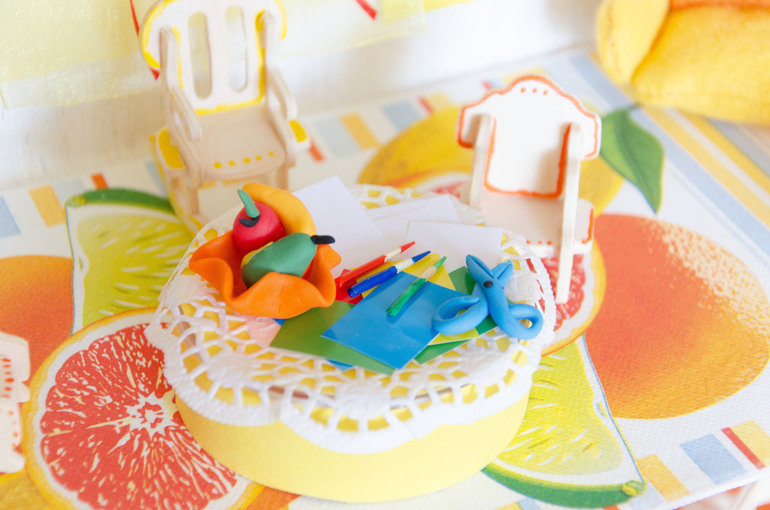 Карандашики из зубочисток, раскрашенные красками. Ножницы и ваза с фруктами из пластики.