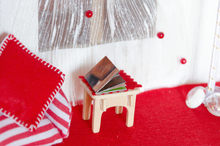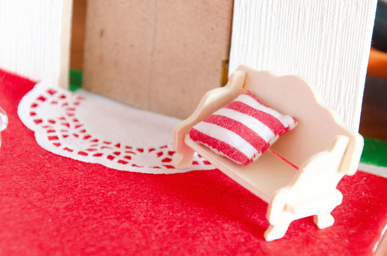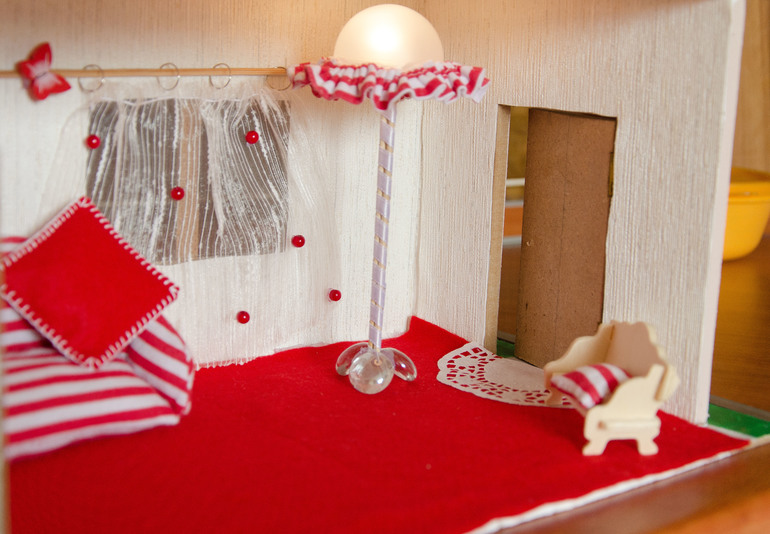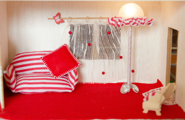 Гостиная у нас получилась минималистичная). Красный ковер (фетр), диван с подушечкой из фетра, небольшой журнальный столик и вместо абажура - торшерчик, в котором можно включить свет! Темные шторки шить не стала, обошлась легкой тюлью, украшенной красными бусинами. Диванчик шила из старой футболки (я теперь вообще никакие куски ткани не выбрасываю), чтобы получилось в тему) Нарисовала произвольно, вырезала 2 детали и сшила). очень просто.