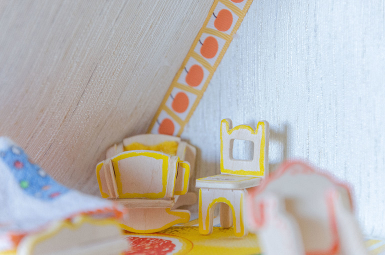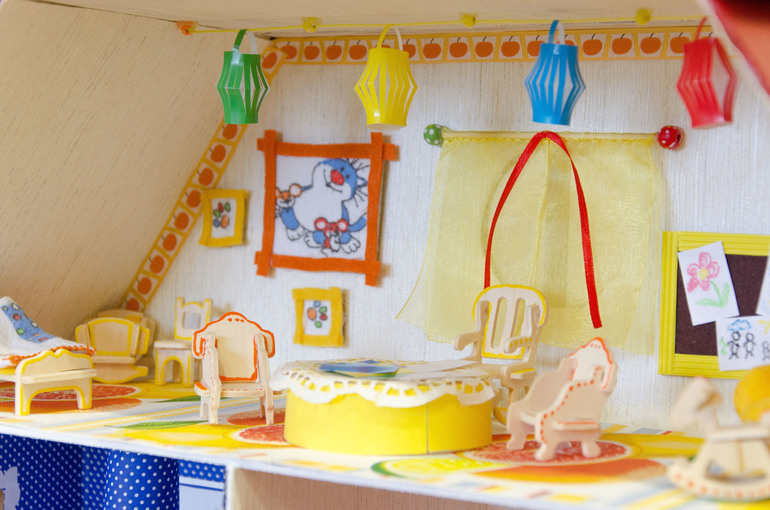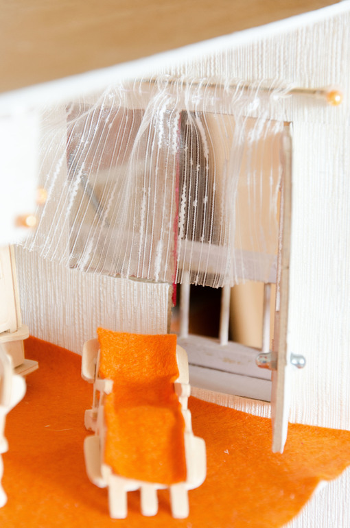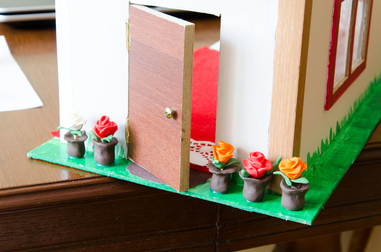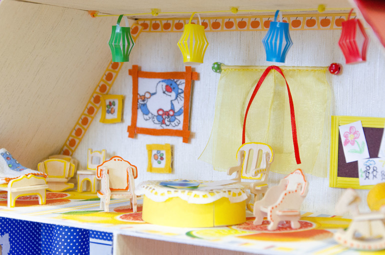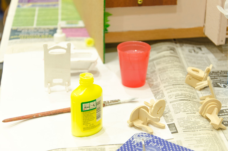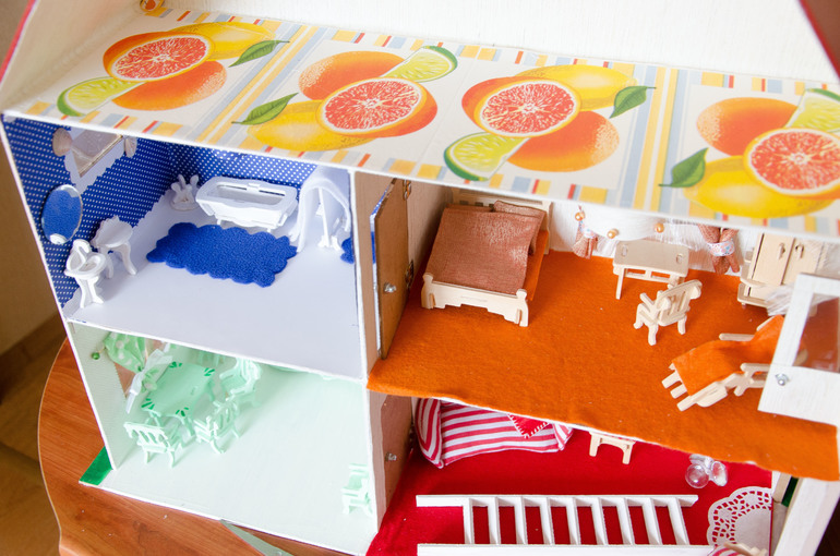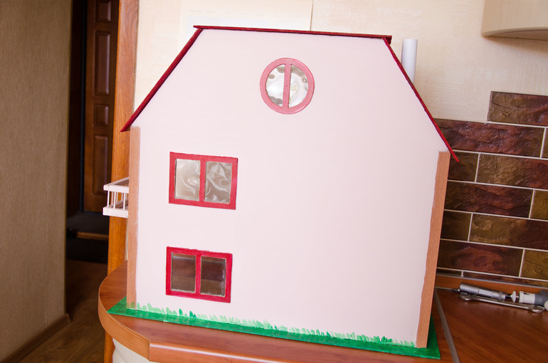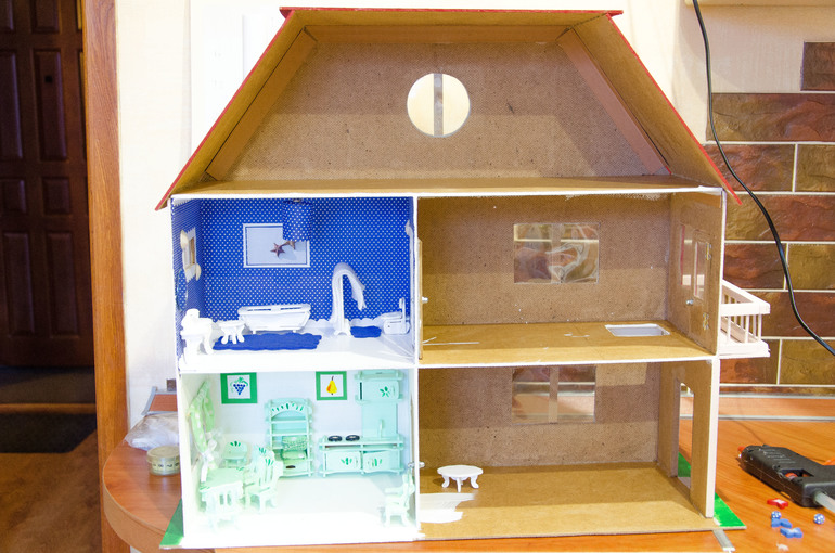 Домик получился в 51 см в высоту, 52 см в ширину, 17 см в глубину. Имеет 3 этажа. Первый этаж - кухня и гостиная, второй этаж - ванна и взрослая спальня, третий этаж - детская. Я хотела сделать все сильно заранее, чтобы точно успеть. Но в итоге эскиз нарисовала в середине марта (жалко, не сфоткала), благополучно сплавила его папе, который обещал мне помочь вырезать все детали из фанеры (ДВП). А он и сделал всю основную и сложную для меня работу!!! Не просто вырезал каркас, но и склеил его! Я хотела для склейки использовать термопистолет, но папа использовал жидкие гвозди. Спасибо, спасибо, спасибо папа! Каркас - это было самое важное!