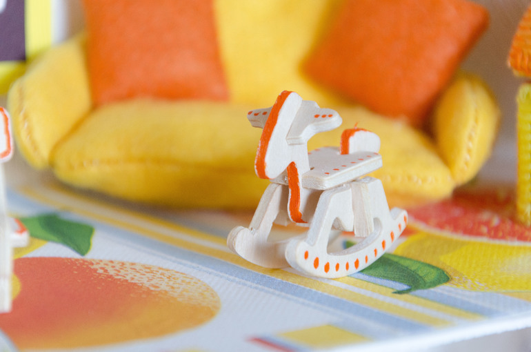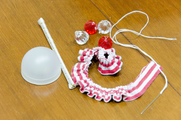 Гостиная у нас получилась особенной из-за того, что там есть свет). Вообще свет хотелось везде, но пока не додумали. А для торшечка сгодилась небольшая лампочка, которую Насте подарили в первом театре. Надеюсь, она потом не разберет торшер из-за этого)) Это же ее лампочка). Лампочка работает от батарейки, маленькая и удобно включается. Итак, светильник из Икеи, остатки от футболки, три бамбуковые деревянные палочки, которые соединила вместе и ленточкой обернула, три камушка из фикс-прайса, чтобы торшер стоял, и термопистолет.