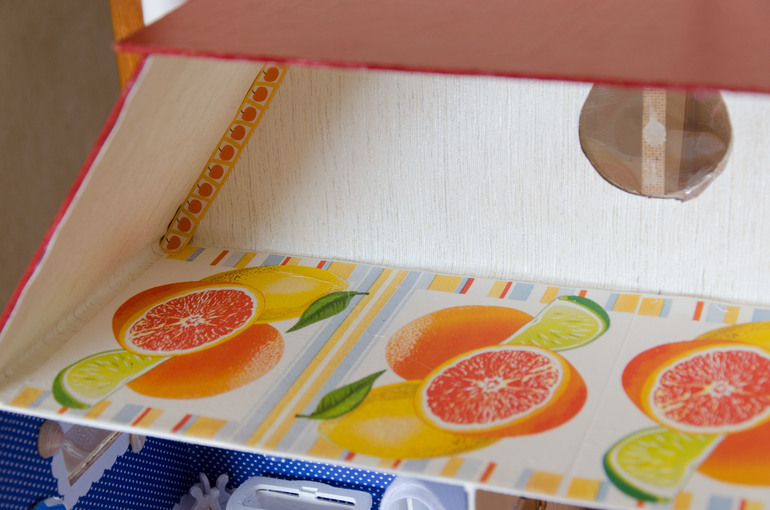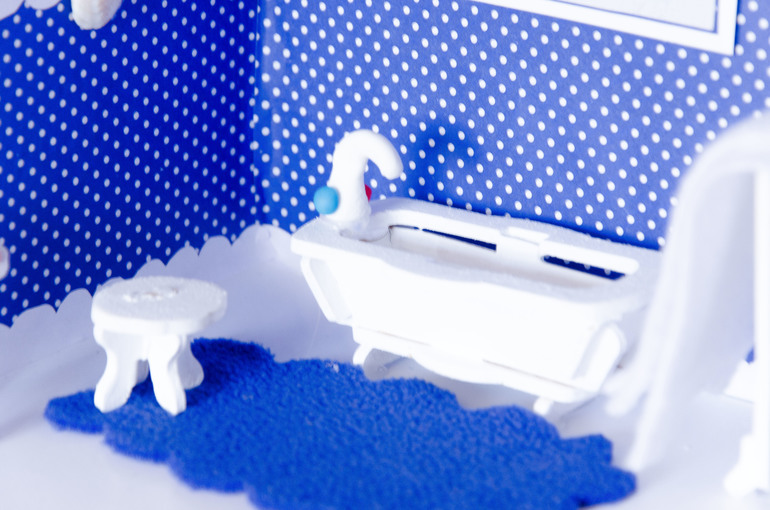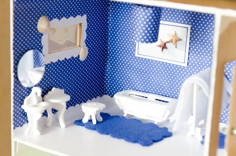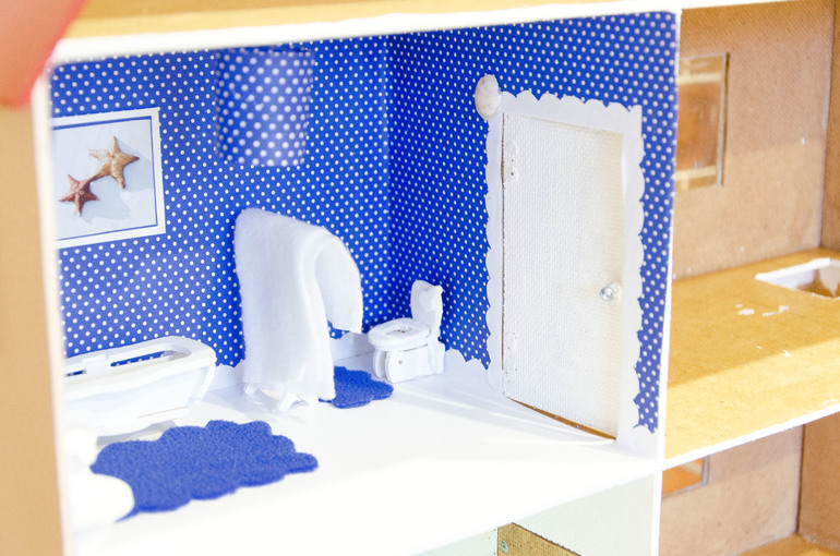 Мы решили поклеить ванну подходящей упаковочной бумагой. Оклеили стены с помощью пва, дверь и потолок покрасили белой краской, на полу в этот раз решили "постелить " картон. По краю сделали бордюрчики из белой офисной бумаги.
