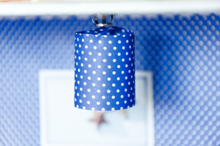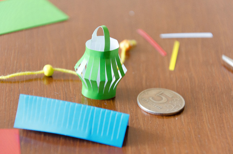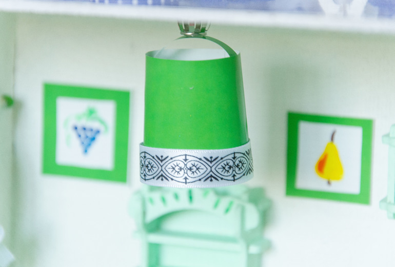 Абажур из зеленой бумаги и ленточки. Приклеила на детальку от настоящей люстры и термопистолетом прилепила к потолку.