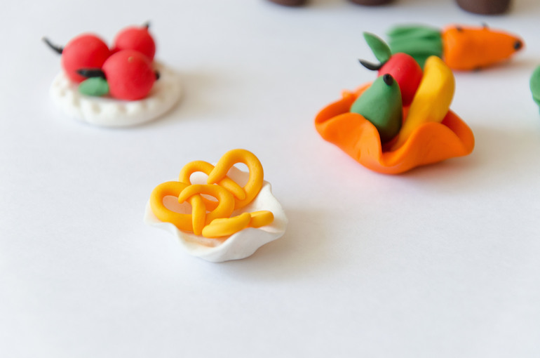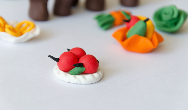 Из пластики налепила деталек. сфоткала не все. Есть кастрюля с крышкой, пара чашек на блюдцах, сковородка, тарелка с яблоками, тарелка с крендельками, капуста, морковка...