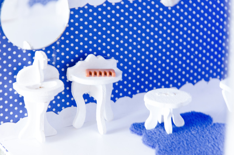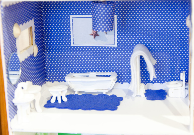 Мебель покрасили белой акриловой краской. Получилась сама ванна (кран потом я долепила из пластики), раковина, столик, туалет, стульчик и загородка для туалета. Зеркальце прилепили настоящее (по-моему из фикс-прайсовского набора с резиночками для волос), полотенца - из белого флиса, коврики - из синего флиса. Стену украсили морской картиной)). Расческа от ежиков из Sylvanian families. Абажурчик из той же упаковочной бумаги.