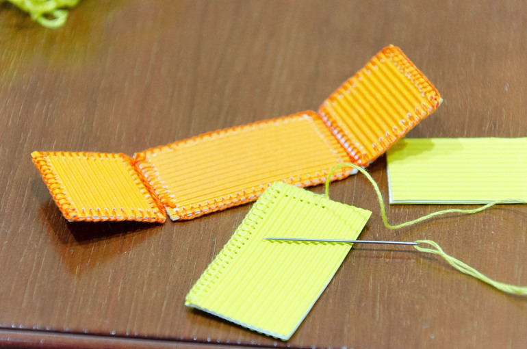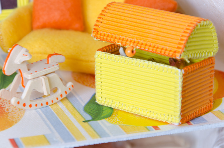 Потом сшила сундучок с игрушками. Раньше я такие сундучки из открыток шила - вырезаем детали, прошиваем по всему периметру швом через край с петелькой и соединяем)