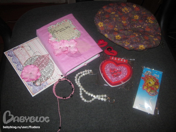 А это просто сокровищница,куча вещей сделаных её руками из которых каждая вещь заслуживает отдельного внимания.... Браслет из жемчуга,я забрала себе,он очень нежный и очень сочетается с другим моим серебряным браслетом с жемчужинами)Второй браслетик достался Веронике ,очень оригинальное сочетание чёрных камней с плетением,он замечательный)))Косметичка,вот это вообще шедевр,насколько я помню ,это древнее корейское рукоделие и каждый шовчик делается вручную,Динарик ,я решила использовать её немного по назначению и сложила туда всю бижутерию и заколочки)Открытка-очень нежная,такая девчачья ,Вероника только и успевала ахать и охать и уже её спрятала,завтра хочет подружкам в школе показать)Ну и блокнот,который я оставила на десерт,он бесподобен ,всё сделано с любовью,очень классный)))Мы с Вероникой долго не могли его поделить,я честно признаюсь,я пыталась его выдурить у неё,но она не поддалась.......Теперь она там записывает свои секретики)))))Теперь она хочет написать тебе письмо,вот правда что именно,не знаю)))))И ещё хочет научиться у тебя создавать такие же красивые вещи)))))Спасибо,моя родная,за такую суперскую посылку!!!!!Ты замечательный и очень добрый человечек!!!!!Мы вас с Дианкой очень любим!!!!