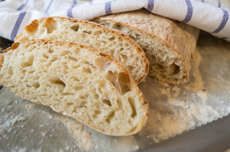 Ну, и с пористостью, конечно, беда. Но это я ещё немного накосячила, когда перекладывала хлеб на противень. И расстойка у меня получилась слишком долгая. А ещё говорят, что надо печь из итальянской муки, она правильную пористость даёт. Но мне что-то думается, что руки из плеч бы тут больше пригодились.
