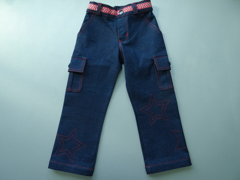 Джинсы для Арсения по модели из отто 2013\1. Очень мне захотелось пристроить звездатую ленточку, а тут на столе лежат раскроенные джинсы, приложила, решено, шью звездатые джинсы.
