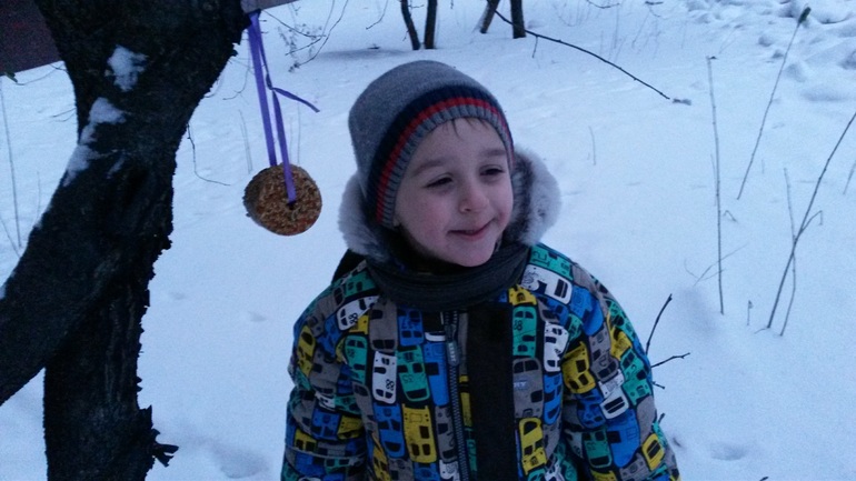 - Сделать кормушку для птиц. Сделали вот такую. В качестве связующего взяла желатин, но слишком сильную концентрацию на морозе вообще каменная стала, хорошо, что оттепель на нг праздники была, склевали.