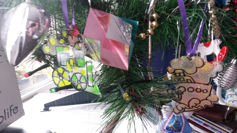 - Сделать елочную игрушку. У нас были витражи в виде самолета, парохода и паровоза. Раскрасили все, кроме самолета, он священен.