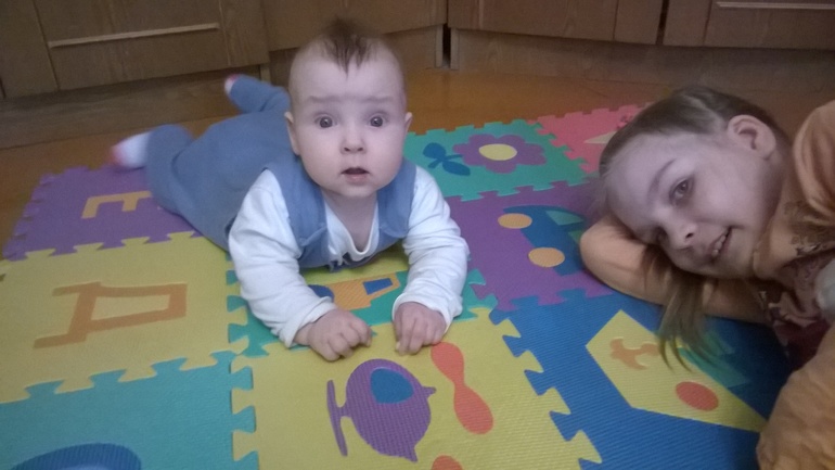 стоит на четвереньках и раскачивается, доползает до желаемой цели, сидит полулёжа на боку опираясь на руку. Много агукает, кхыкает, звуки усложняет. Смеётся если его начать смешить) любит мультики, узнаёт родственников и радуется им, любит когда на него обращают внимание. Очень любит сестрёнку.