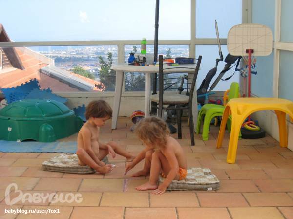 но пусть политикой занимаются мужчины. моя боль - это дети. и какая разница, чьи они. вот моя бусинка на пляже заигралась с израильскими детьми, а когда тех позвали обедать - увязалась за компанию. и ее накормили. меньше всего я хочу думать о том, что эти малыши вместо беготни и так раздражавших меня воплей будут сидеть в мамаде.