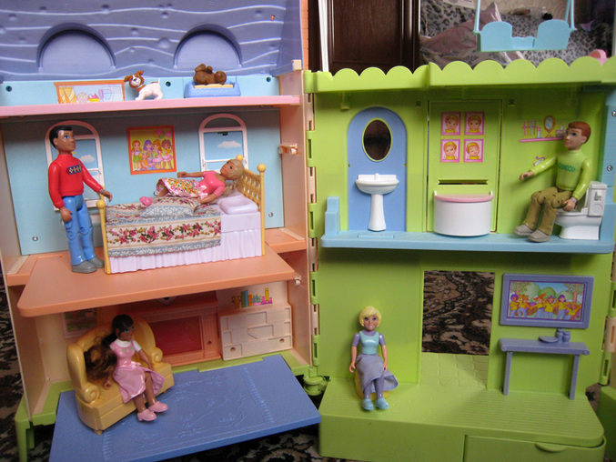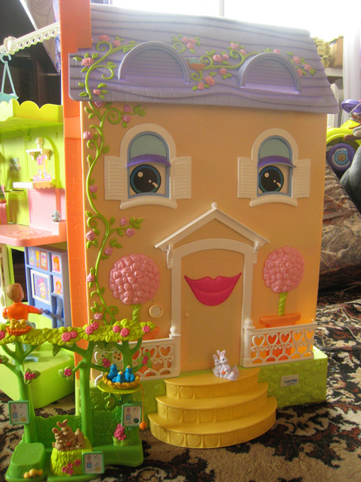 домик интерактивный - нашпигован датчиками. садится кукла на унитаз - слышен слив воды и напоминание: не забудь помыть руки после туалета. подходит к раковине - домик говорит: чистить зубы надо утром и вечером по 2 минуты )) холодильник перечисляет, кого надо покормить. радио поет обучающие песни про то, что надо самому убирать игрушки, не обижать животных и тд.