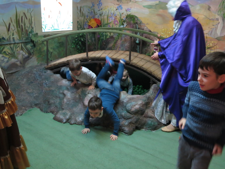 минус сценарию. игры чередовались с теорией, вряд ли нужной детям, особенно пришедшим на встречу с любимым буратиной. узнать все о писателе коллоди, о редакции, с которой он сотрудничал, о способе очинки перьев и производстве чернильниц - мои дети вообще не поняли, куда и зачем они попали. слава богу, что в промежутках были игры, правда никак не связанные с лекцией. вот дети накупались в пруду с шариками, где искали ключик
