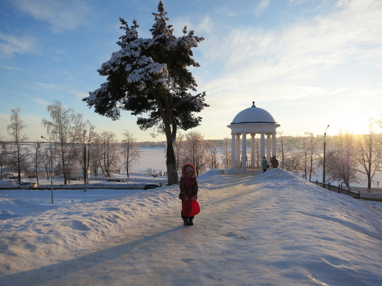 на следующий день ударили морозы. но мы все равно ходили гулять, каждый день катались с горки. лед на волге окреп, местные тут же проложили тропку на ту сторону реки