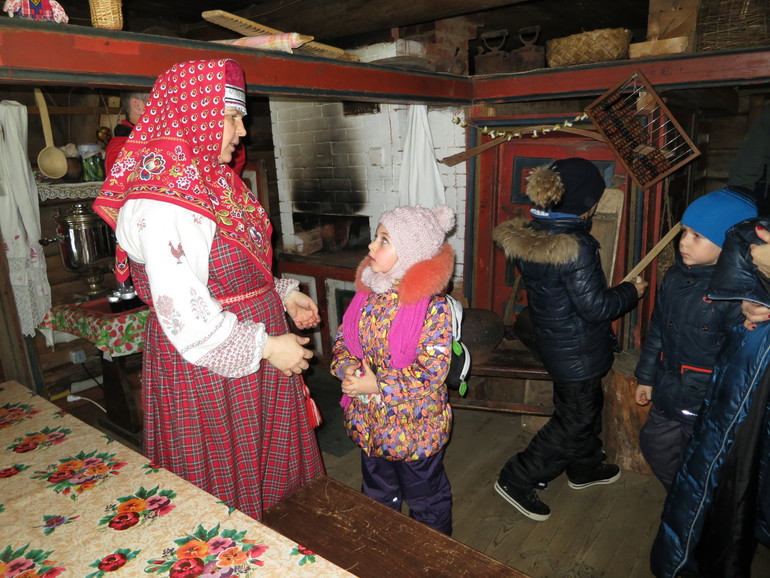 кроме того, что напились чаю из самовара с пряниками, посмотрели настоящую старую избу, все рассмотрели, потрогали, узнали что для чего, послушали не только настоящий костромской говор, сказки и присказки, но некоторые чуть не получили ложкой по лбу и нагоняй - за то, что шумели, хихикали, перебивали, толкались. в традиционных семьях было все строго
