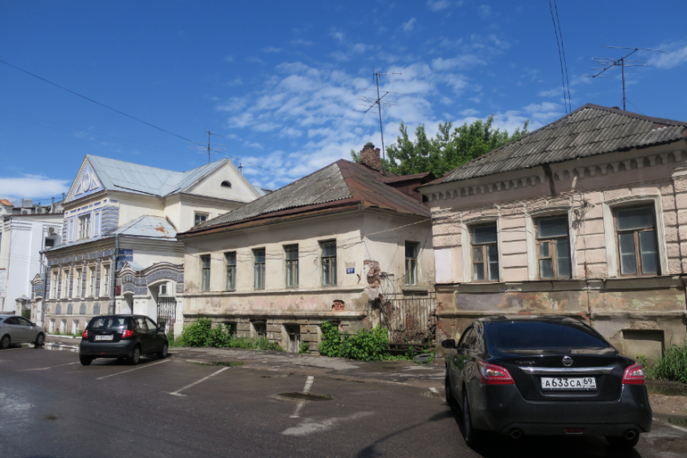 нет, кострома все же другая - там деревянная часть больше. и дома побогаче. состояние такое же плачевное, но буйство северной фантазии налицо: ставни резные, на доме то башенка, то мезонин.