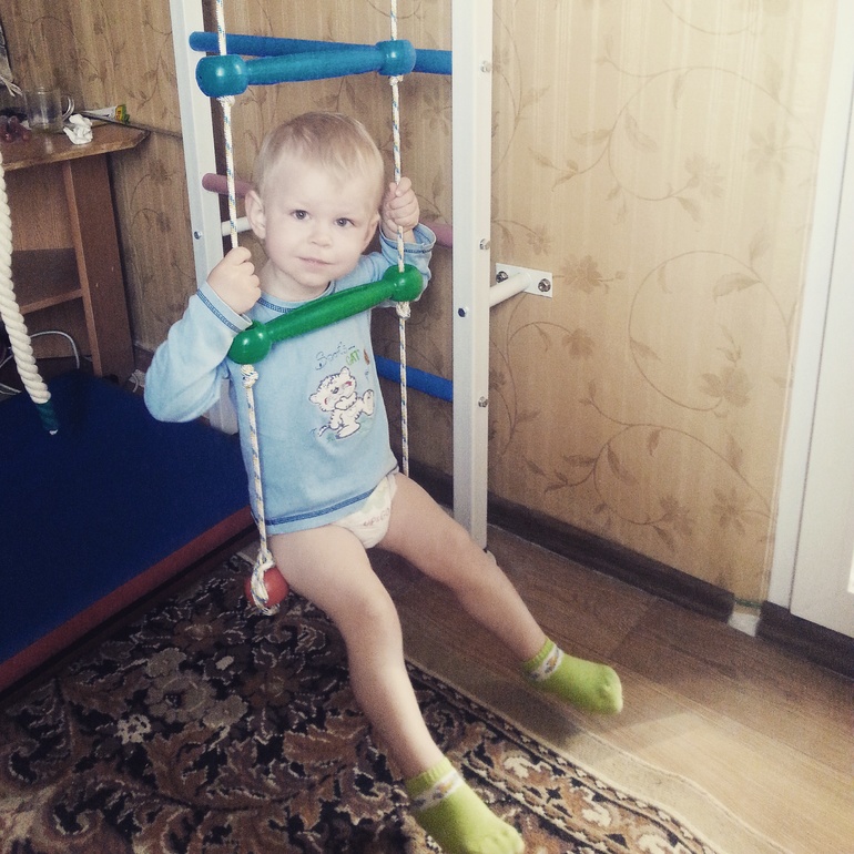 Купила ему стенку шведскую сам залазит на самый верх и сам слазит я даже не страхую. Висит на кольцах немножко. И самокат купила где два колеса впереди копия максимикро типа. Сам ездит но с поворотом еще не освоился (где наклоном ручки поворачивать) и я привязала веревку и помогаю подтягиваю в стороны если заносит.