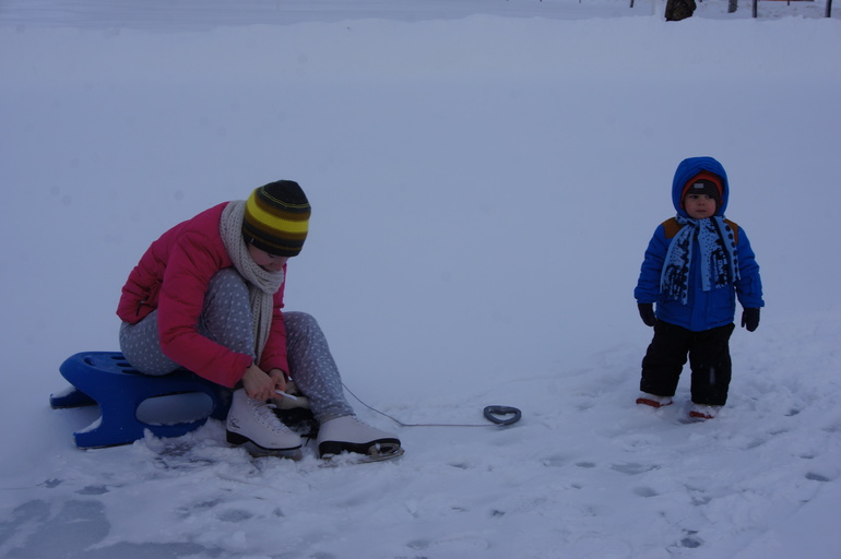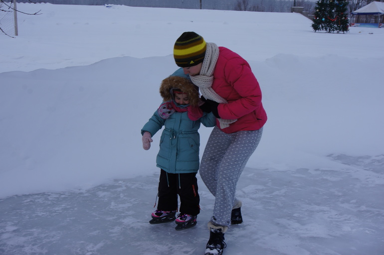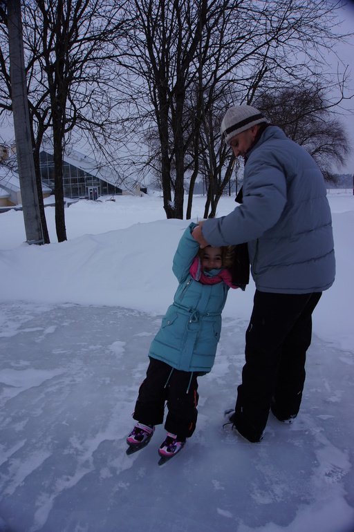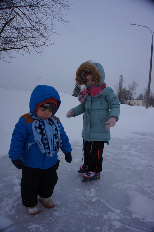 Погода выдалась морозной и ветреной, особо долго не гуляли, но тем не менее попробовали научить Юлю кататься на коньках. Пока до фигурных поворотов не доросли, но стоять и не падать - вполне:
