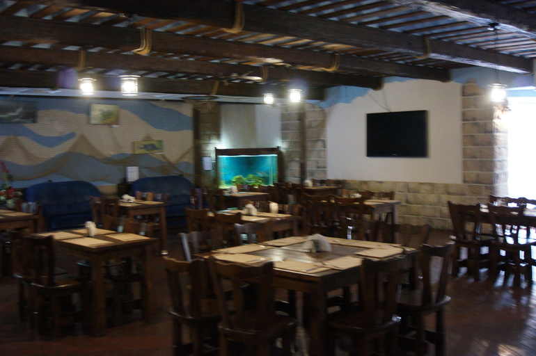 В ресторане шведский стол с 3-х разовым питанием, очень просторно и уютно. Основной зал оформлен в современно-новогодней тематике, а второй - как в корабле: все в снастях, рисунках рыб и огромные аквариумы с рыбами и черепахами, дети тут проводили 90% времени пока мы ели: